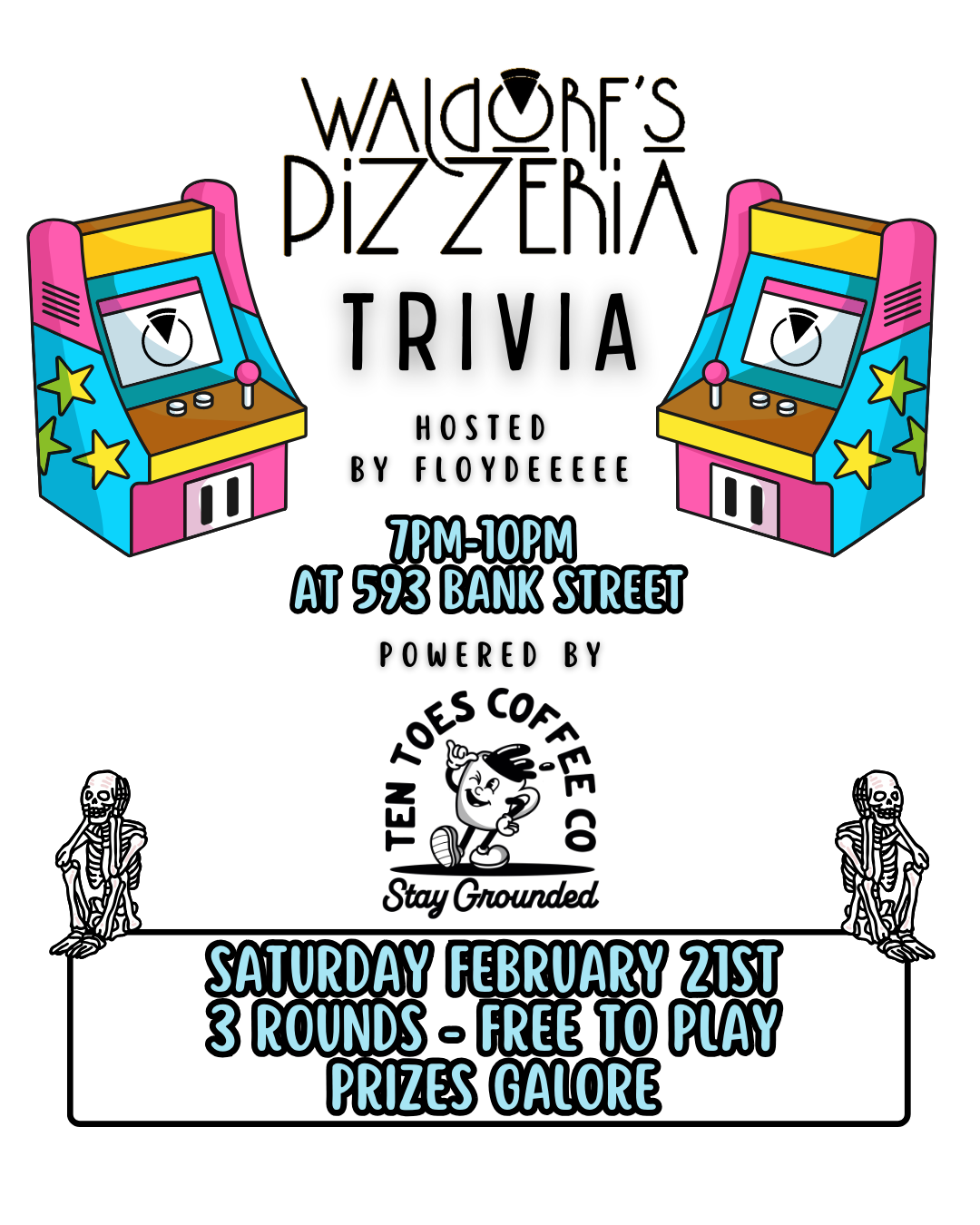 Waldorfs Trivia is back Saturday February 21st with our host Floydeeeee ! Tons of wicked prizes and the best pizza date with your pals 🍕🍺🍷🎁 Waldorf’s Pizzeria, Ten Toes Bank and Floydeeeee cordially invite you to our favourite time of