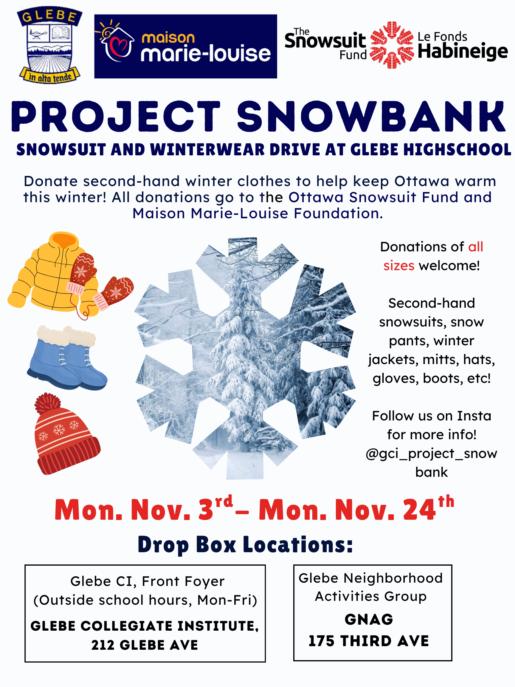 Project Snowbank is an entirely student-led snowsuit drive, based out of Glebe Collegiate Institute. This is the project's second year running, after a very successful snowsuit drive last year, thanks to the generosity of the community. The students leading Project