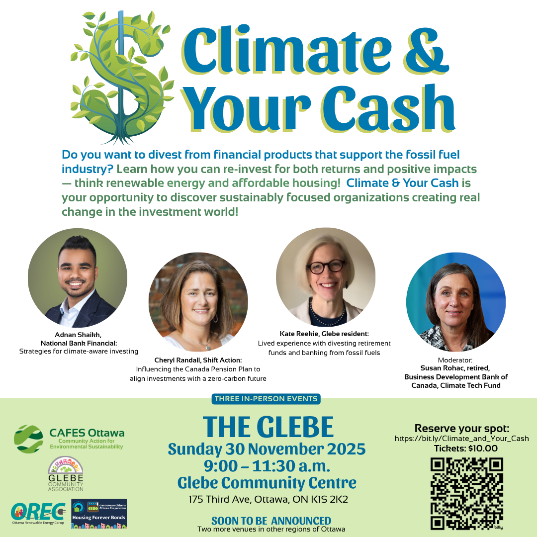 Climate & Your Cash is a practical morning workshop on how to align your money with your values—without sacrificing returns. Join us Sunday, November 30 from 9:00–11:30 a.m. at the Glebe Community Centre (Scotton Hall). Moderator Susan Rahoc (retired managing