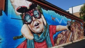 | Flying Over - Dan Metcalfe Location: 801 Bank Street, Little Victories Pure exhilaration captured on brick. This piece invites you to shed gravity and imagine the neighbourhood from above, wind in your face, the world falling away beneath you. Working from Barnstormer Studio in the Glebe, Metcalfe brings the same precision and artistry from his tattoo work to large-scale murals. This piece pairs beautifully with Little Victories' excep- tional coffee. |