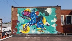 Untitled Artwork – Dominic Laporte Where: The Rowan, 915 Bank Street Laporte appears three times in the neighbourhood, each piece revealing a different facet of his artistic voice. His untitled work on the south facing wall of The Rowan establishes his bold presence. |