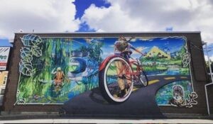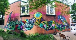 | The Start of a Fable - Mique Michelle Location: 802 Bank Street, Shoe + Shoe A story unfolds across the wall in vibrant, dreamlike imagery—creatures and flora tangled together as if mid-tale. Michelle invites you into the opening lines of something mythical, where the ordinary world dissolves into magic and possibility. You can sense the narrative just beginning, the kind that pulls you in and refuses simple endings. View it from the Fourth Avenue Baptist Church courtyard, where benches and shade trees offer a peaceful vantage point |