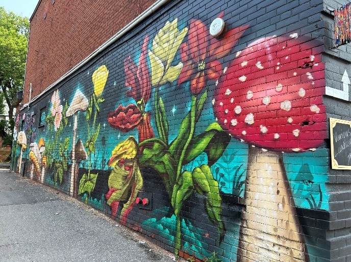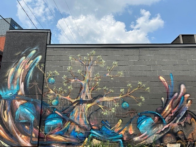 Breathe Over - Jocelyn Galipeau Location: 166 Second Avenue, Hair on Second (west-facing wall) Hidden from the main thoroughfare, this piece rewards those who wander. Galipeau blends the organic and the structural—nature's softness against the hard lines of urban planning. There's something meditative here, an invitation to pause and let beauty catch you off guard. True to its name, it takes your breath away |