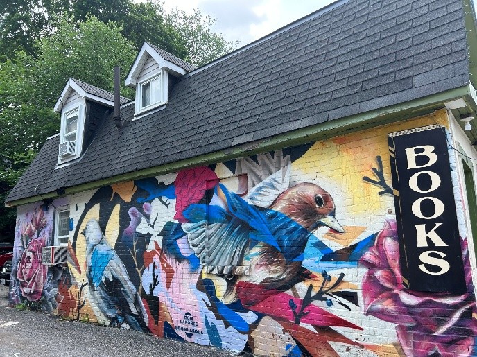 Nature Entwined - Dominic Laporte Location: 116 Third Avenue, Octopus Books Flight captured mid-motion, nature woven into every corner. Laporte transforms the entire building into a sanctuary where birds and blooms spiral together in brilliant color. The piece refreshes the space while complementing the vibrant character of the bookstore, drawing from two of Laporte's paintings from 2020 and 2021. It represents his exploration of translating studio work into larger exterior spaces—a conversation between intimate canvas and expansive wall, between the stories inside and the story told outside. Octopus Books is a beloved independent bookstore worth exploring |