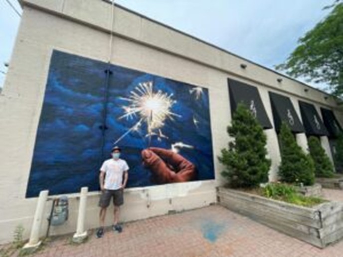 | Create a Spark - Dan Metcalfe Location: 790 Bank Street, Davidson's Jewellers A single moment of ignition, held in hand. Metcalfe captures that fragile instant before the spark becomes flame—the potential, the risk, the wonder of creation itself. Placed at Davidson's Jewellers, a Glebe instit- ution for over 85 years, the mural connects past and present—where century-old craftsmanship meets contemporary street art. This piece reflects Metcalfe's own dual practice as both a tattoo artist at Barnstormer Studio and a muralist—two art forms where precision, creativity, and permanence intersect |